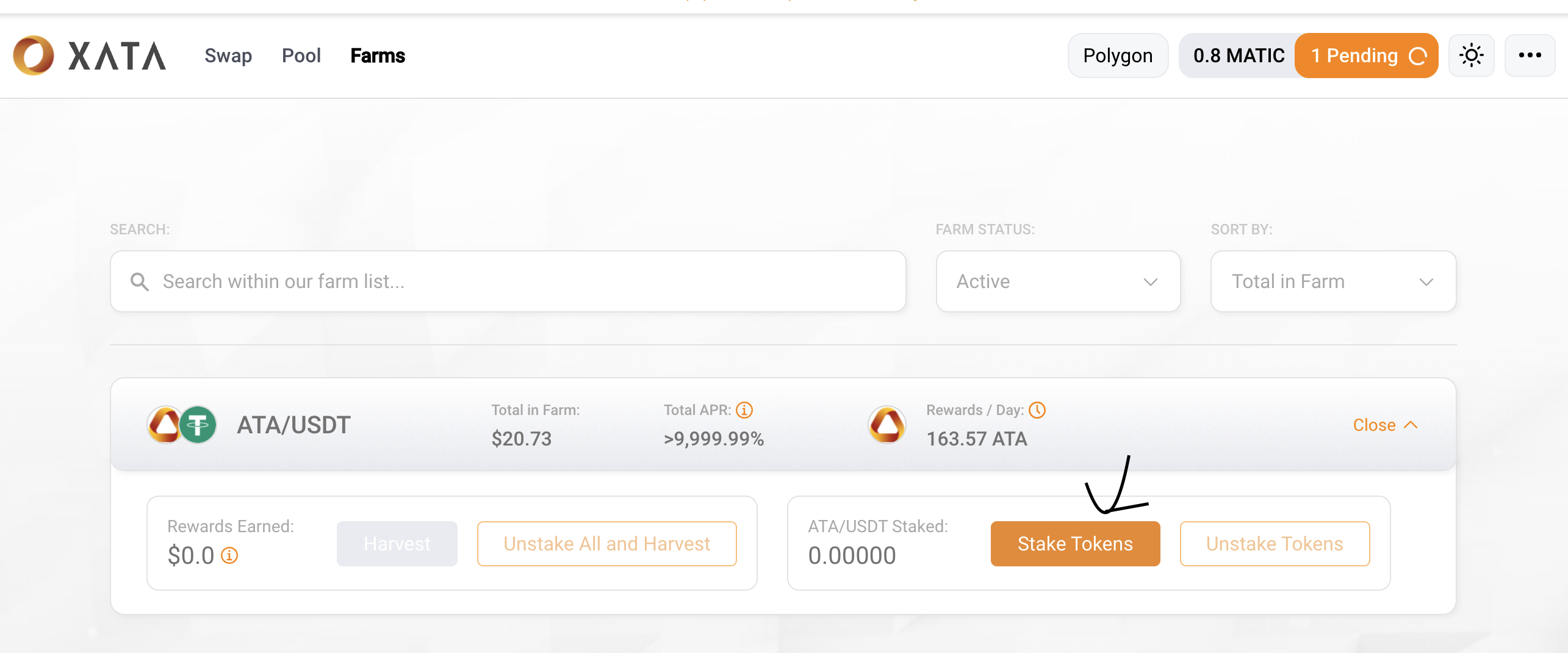 After adding liquidity, return to the Farm page to stake. Click on the 'Stake Tokens' button after opening a farm