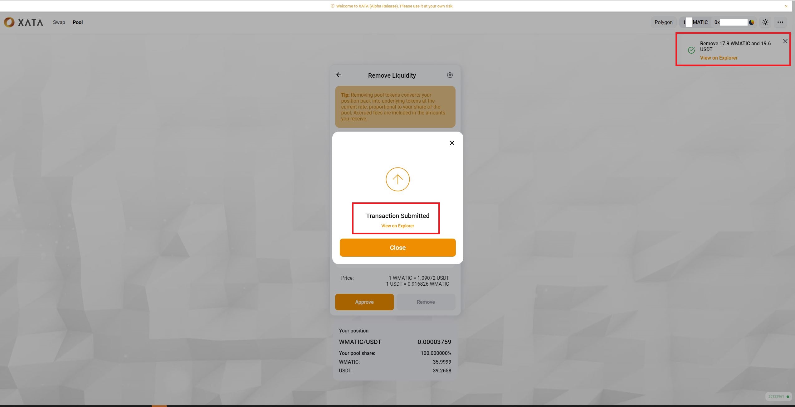 • Once your transaction is confirmed on the blockchain, you will receive your tokens from the removed liquidity pool.